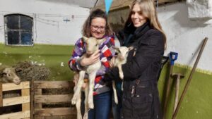 Dit is het grootste lam dat we ooit gehad hebben: 7,6 kilo! Toevallig was die dag ook net het kleinste lammetjes van dit jaar geboren, met 1,3 kilo. Hier Linde en Petra met Mini en Maxi, en die twee samen zodat je het verschil kunt zien.